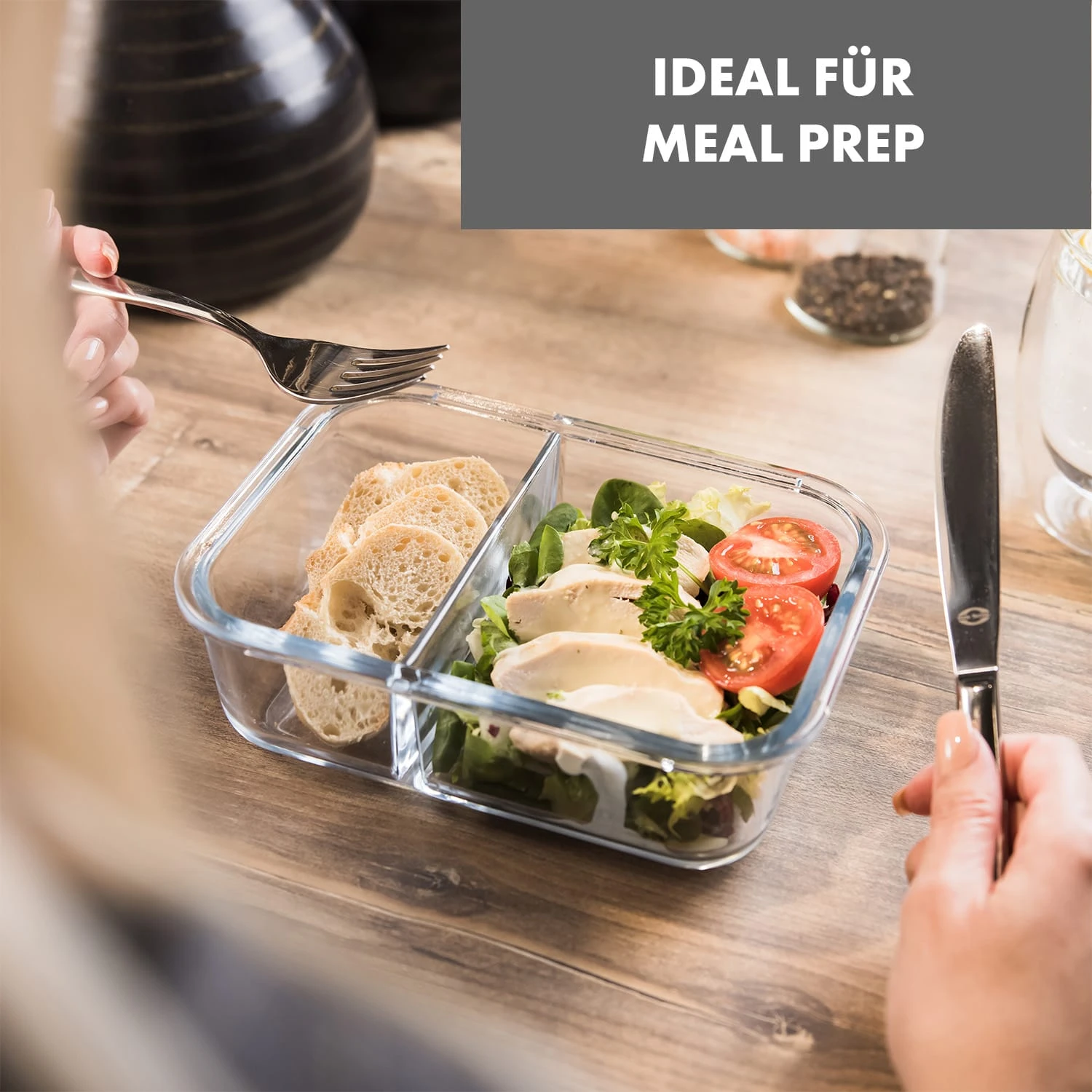 Die Glaswerk Jardine Frischhalteboxen sind aus beständigem und bruchsicherem Borosilikatglas gefertigt und besonders hitze- und kälteresistent. Daher steht dem Einsatz im Backofen, im Gefrierfach oder der Mikrowelle nichts im Weg. Der BPA-freie Kunststoffdeckel mit vier Scharnierverschlüssen sorgt für 100 % Auslaufschutz und Dichtigkeit der Boxen. Mit ihren zwei getrennten Kammern kannst du supereinfach Lebensmittel, die sich nicht vermischen sollen, unkompliziert in einer Box aufbewahren oder mitnehmen. Damit eignen sie sich ideal als Lunchbox für dein leckeres Mittagsmahl auf der Arbeit oder als Ausflugsbegleiter am Wochenende. Ihr Fassungsvermögen von über 1 Liter macht sie außerdem zu hervorragenden Vorratsdosen.