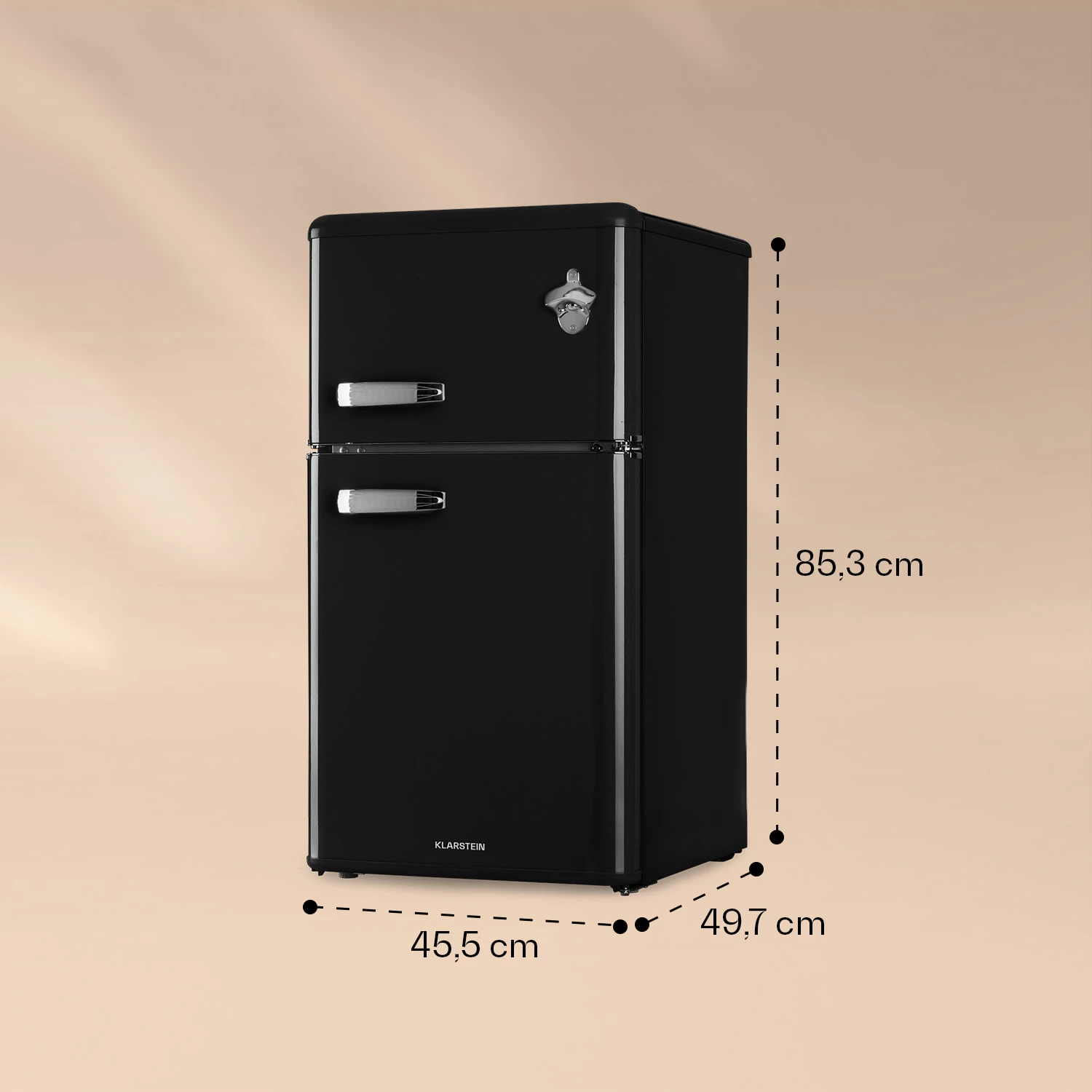 Die Klarstein Irene Kühl- und Gefrierkombination im Retro-Look verleiht deiner Küche mit ihrem peppigen Vint-Age Concept den sprühenden Charme der 50er-Jahre. Mit ihrem großen Innenraum hält sie viele Lebensmittel oder Vorräte lange frisch. Im Inneren kannst du gut für Ordnung sorgen, denn ein Gemüsefach und 2 Fächer in der Tür ergänzen den Stauraum der 2 bruchresistenten Glasablagen. Das topseitige 24-Liter-Gefrierfach komplettiert dein neues Kühlgerät.