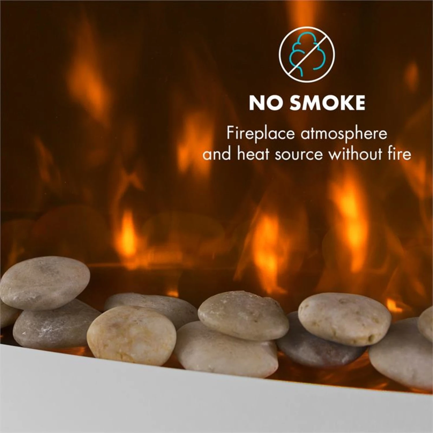 Der Elektrische Kamin Lausanne von Klarstein zaubert eine romantische, stimmungsvolle Atmosphäre durch seinen bemerkenswerten Flammeneffekt – ganz ohne echtes Feuer, Asche und Rauch. Auf Wunsch kannst du die Heizung zuschalten, welche innerhalb von wenigen Minuten eine warme, gemütliche Umgebung erschafft. Dabei musst du dich noch nicht einmal bewegen: Den Kamin aus Glas kannst du auch über die mitgelieferte Fernbedienung steuern. Zusätzlich schöne Effekte neben den züngelnden Flammen schenkt die aus 7 Farben wählbare, dimmbare Hintergrundbeleuchtung und die Deko-Steine bringen Natürlichkeit ins künstliche Feuer.